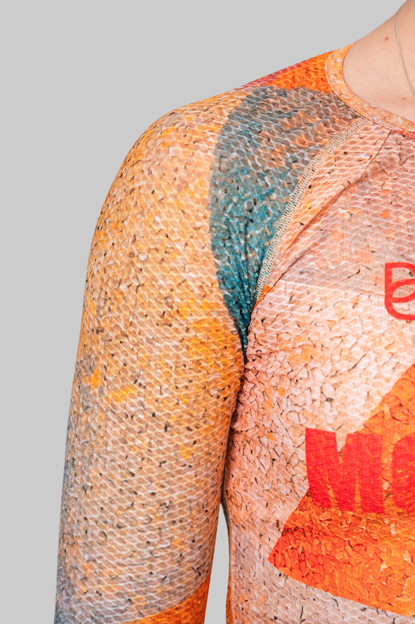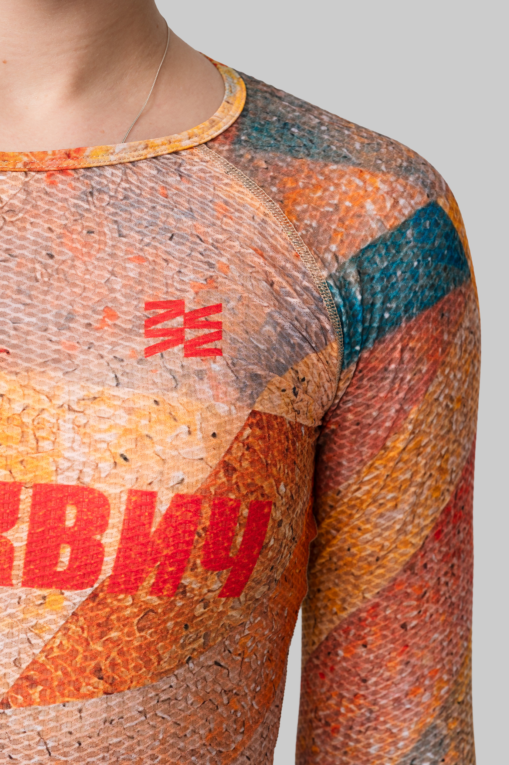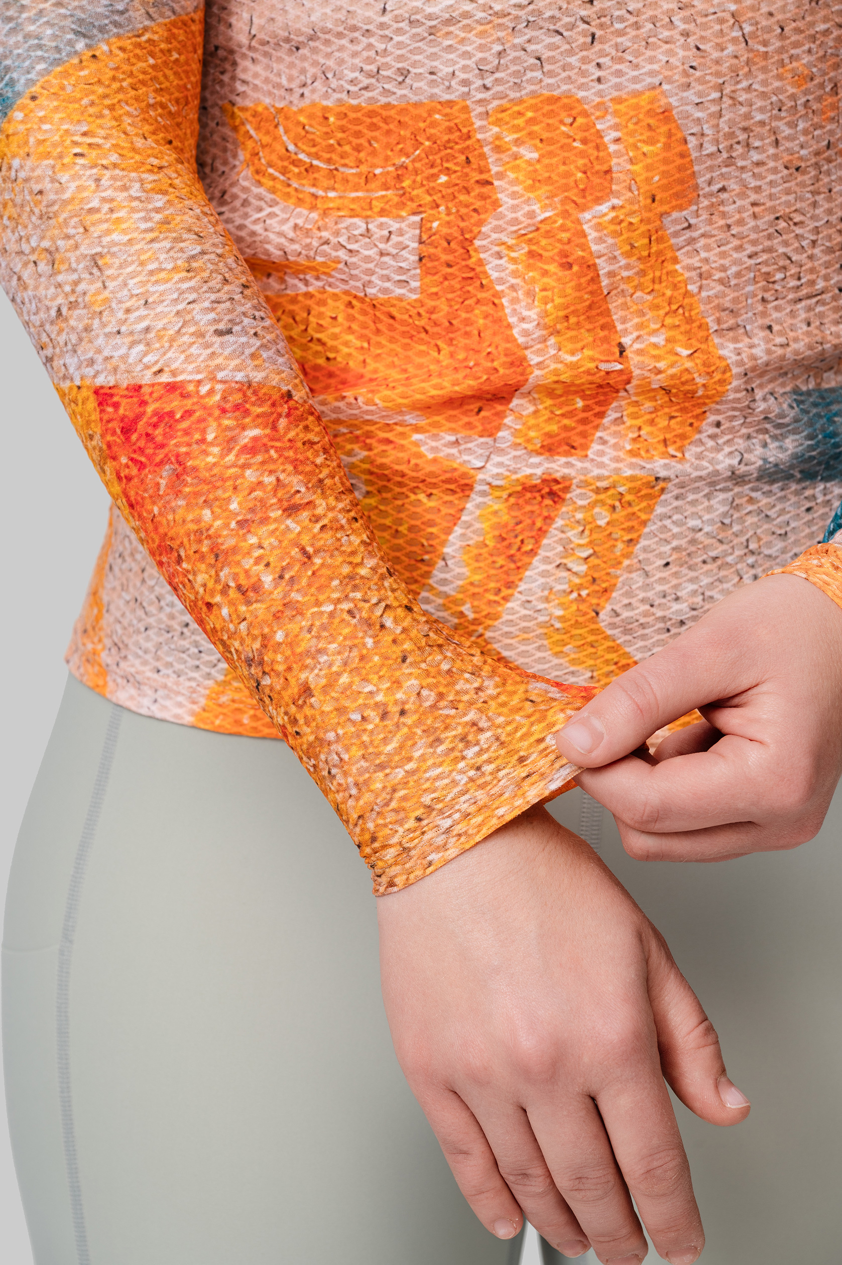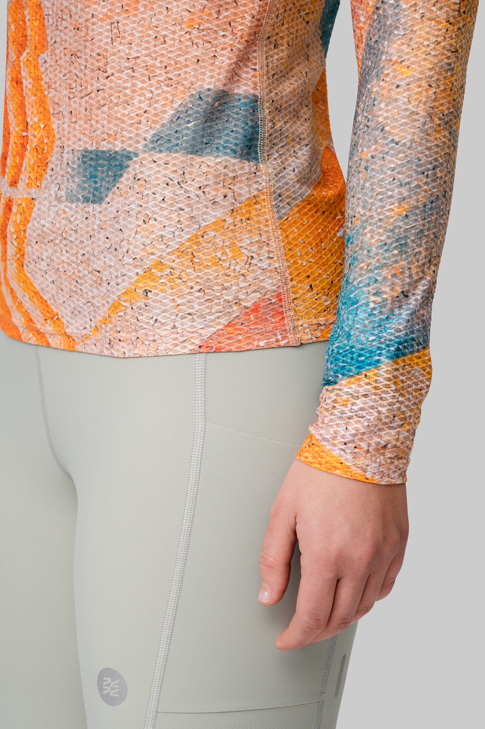 Выполнен из технологичной лёгкой ткани, которая способствует равномерному распределению и испарению влаги. Деликатная эластичная обработка ворота и плоский шов не вызывают дискомфорт и создают ощущение бесшовного изделия.