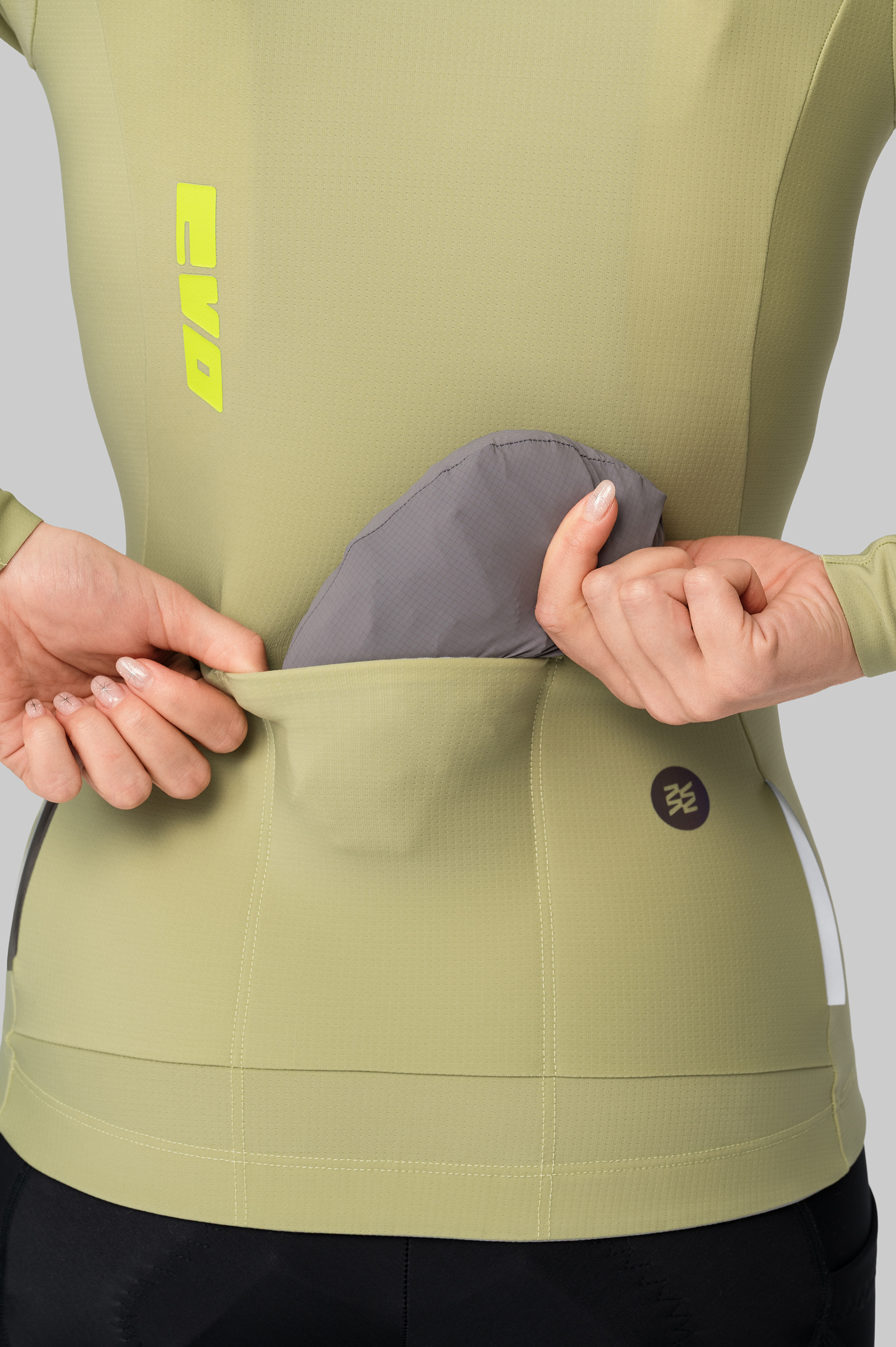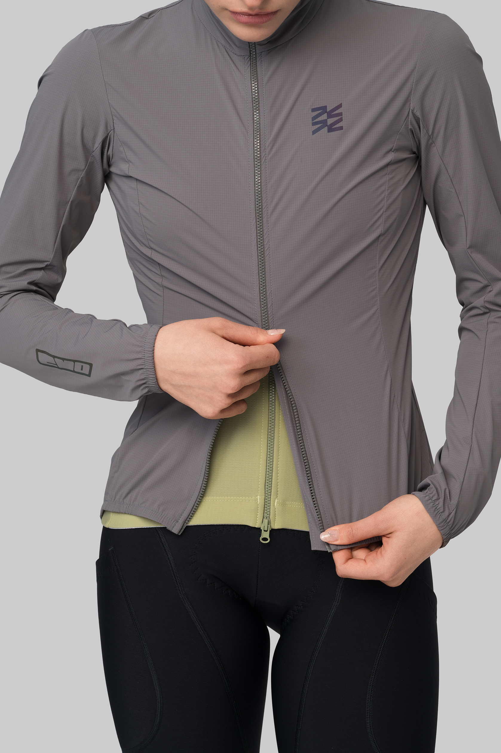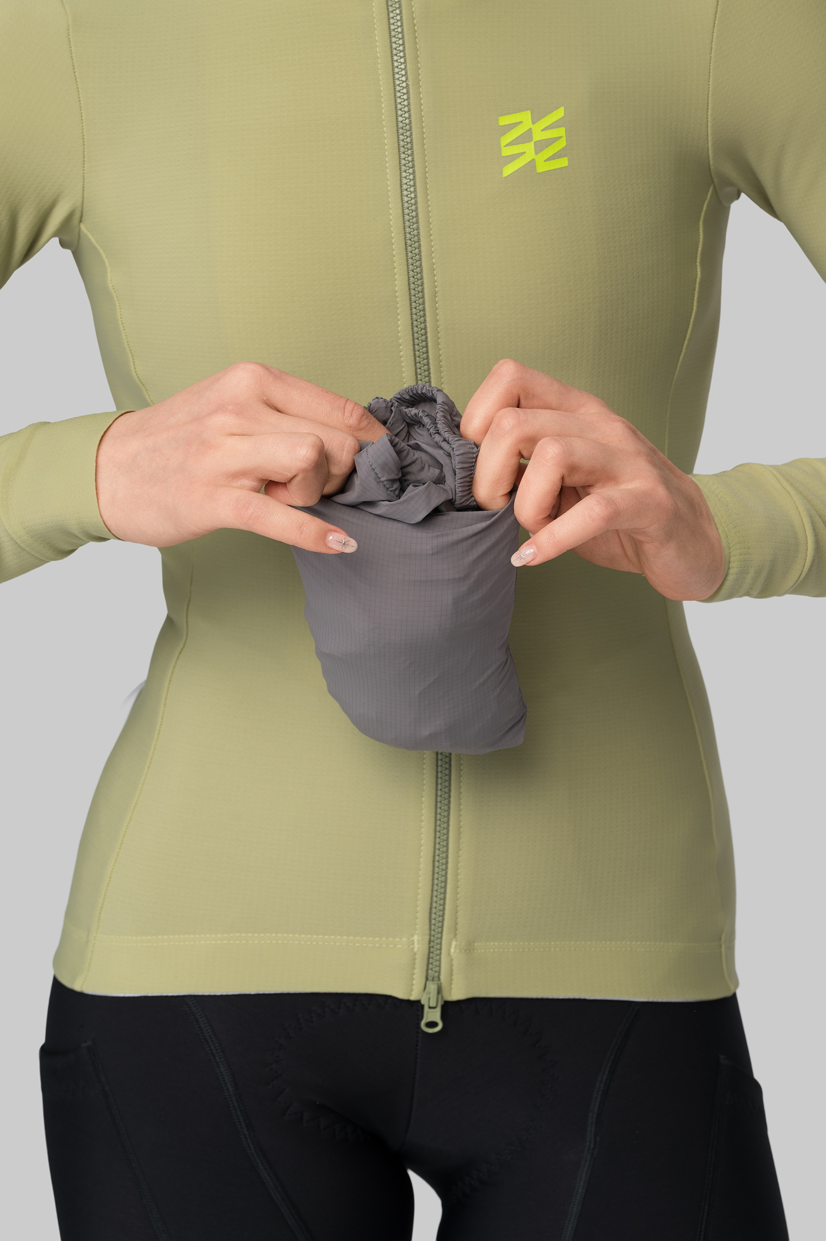 Молния расстёгивается сверху и снизу для желаемого уровня вентиляции. Куртка сворачивается в компактный мешочек, который помещается в карман джерси.