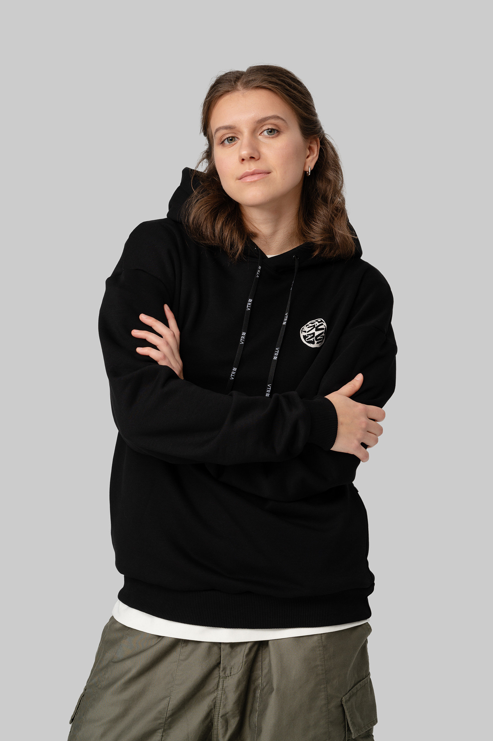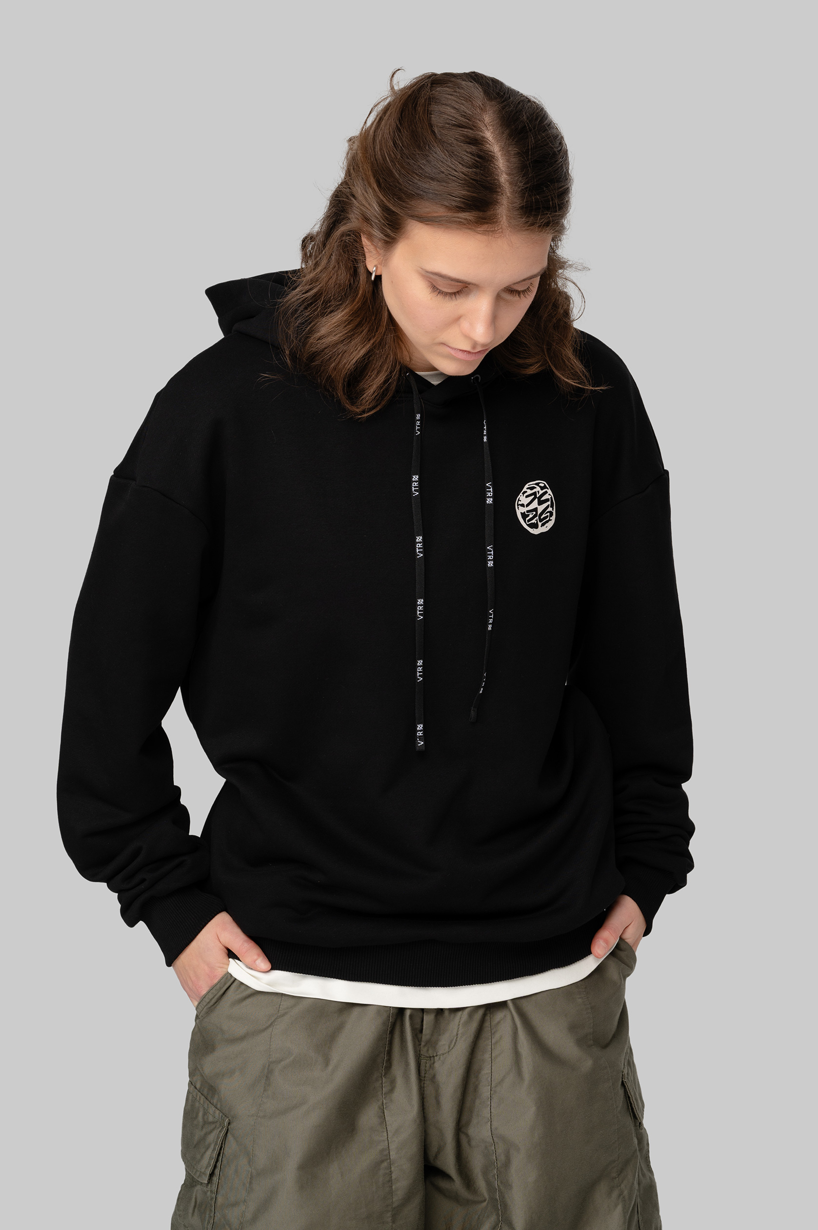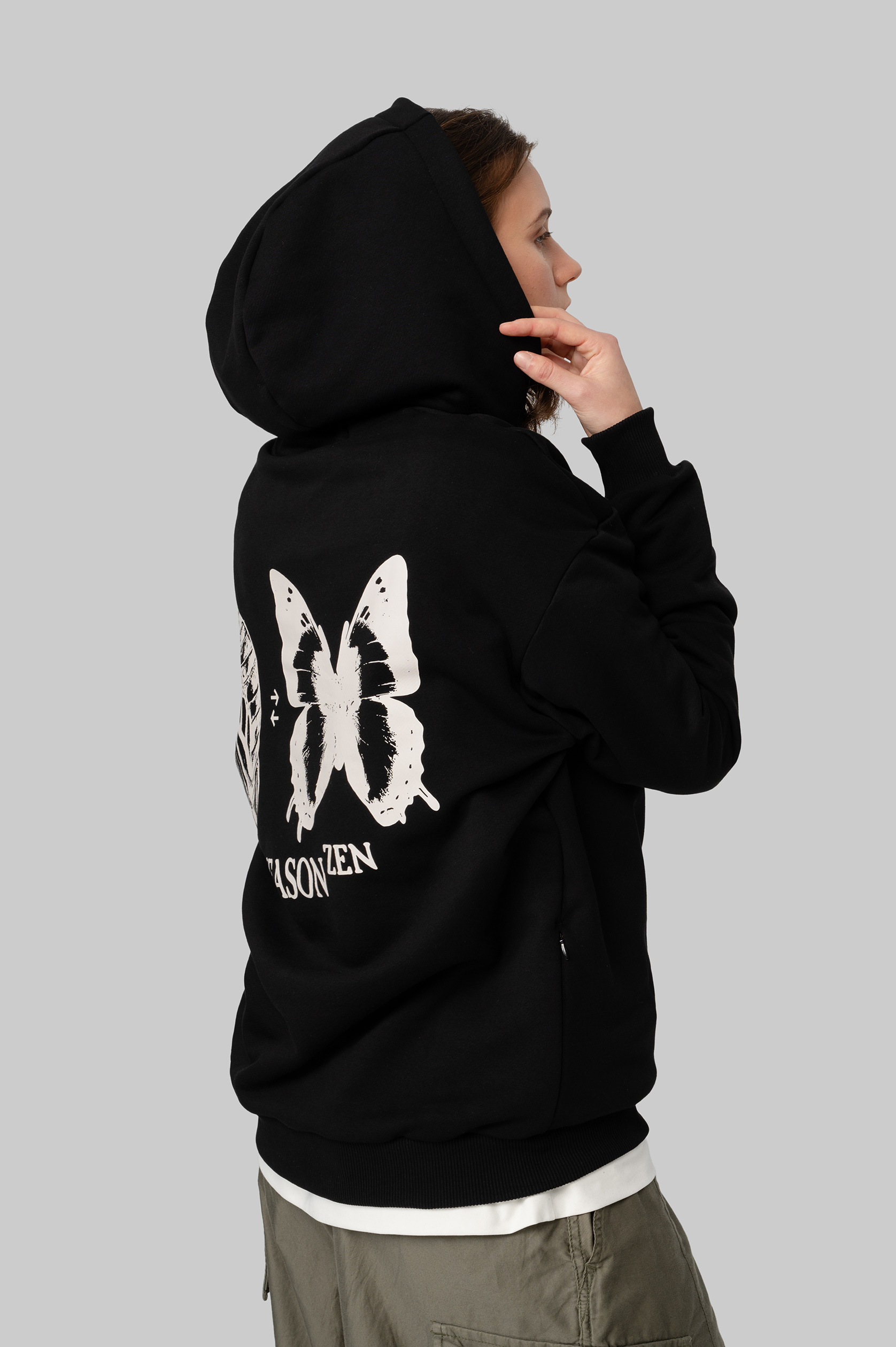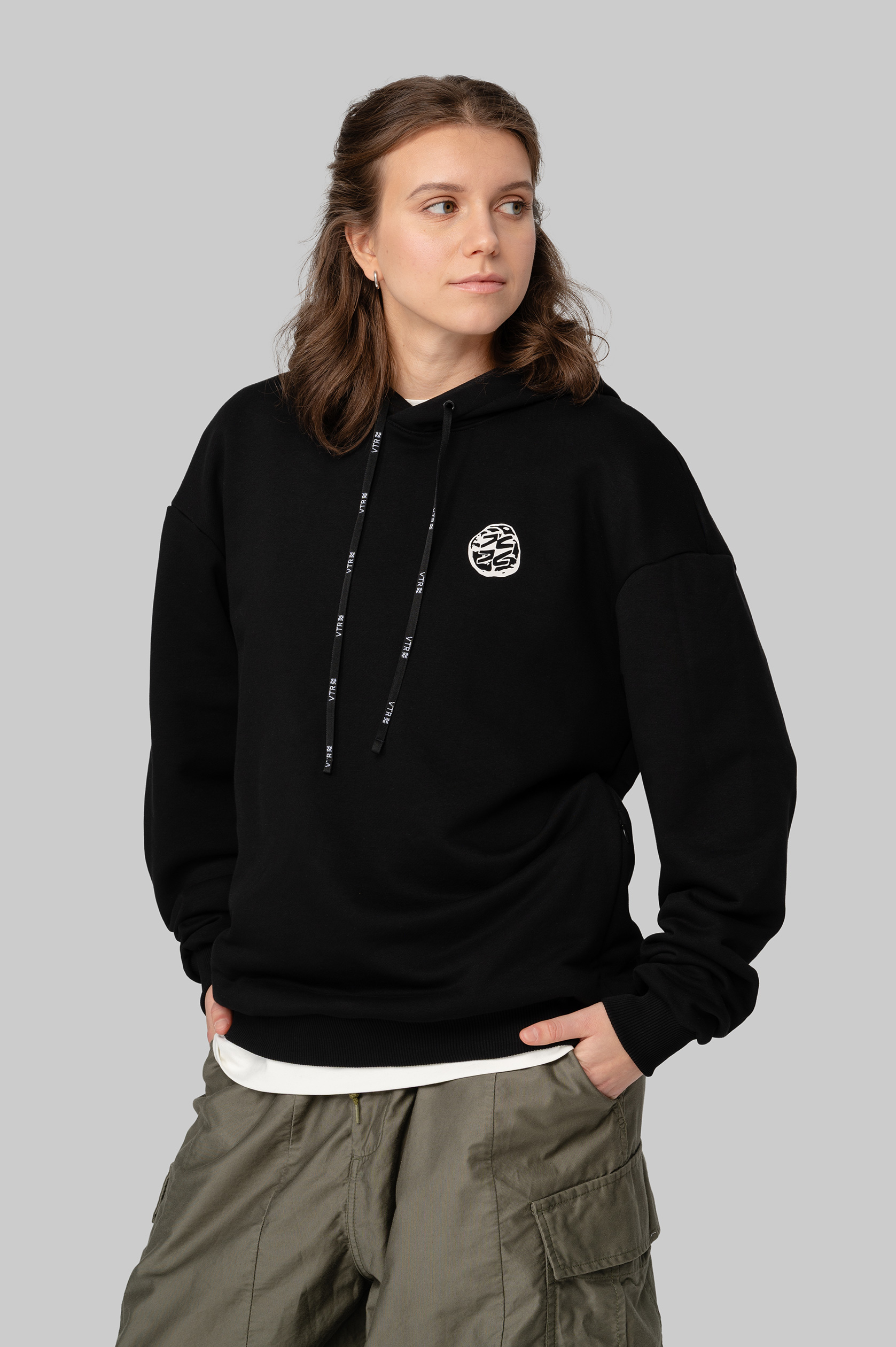 Худи с капюшоном оверсайз из плотного хлопка. Манжеты и нижний край продукта выполнены из мягкой рибаны. На боковых швах расположены потайные карманы на молниях. Дизайн нанесён с помощью устойчивой к стирке технологии DTF. Худи упакована в брендированный мешок из твила с клапаном.